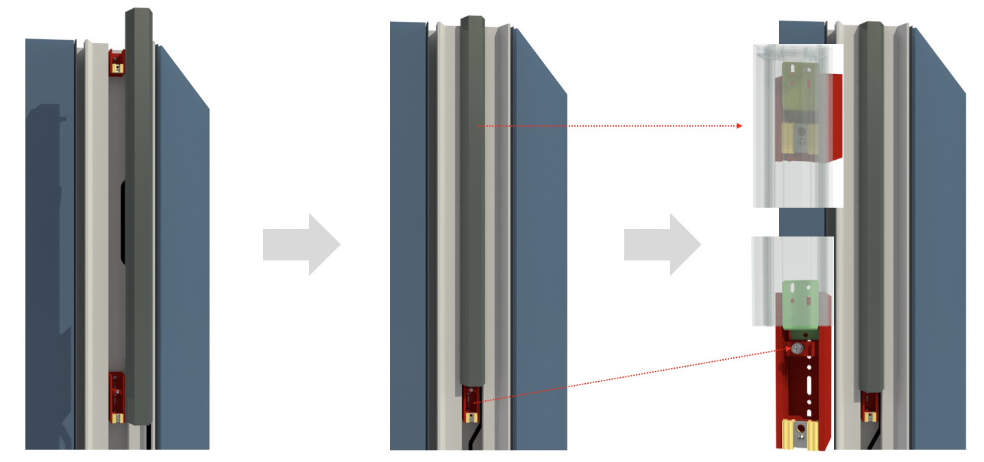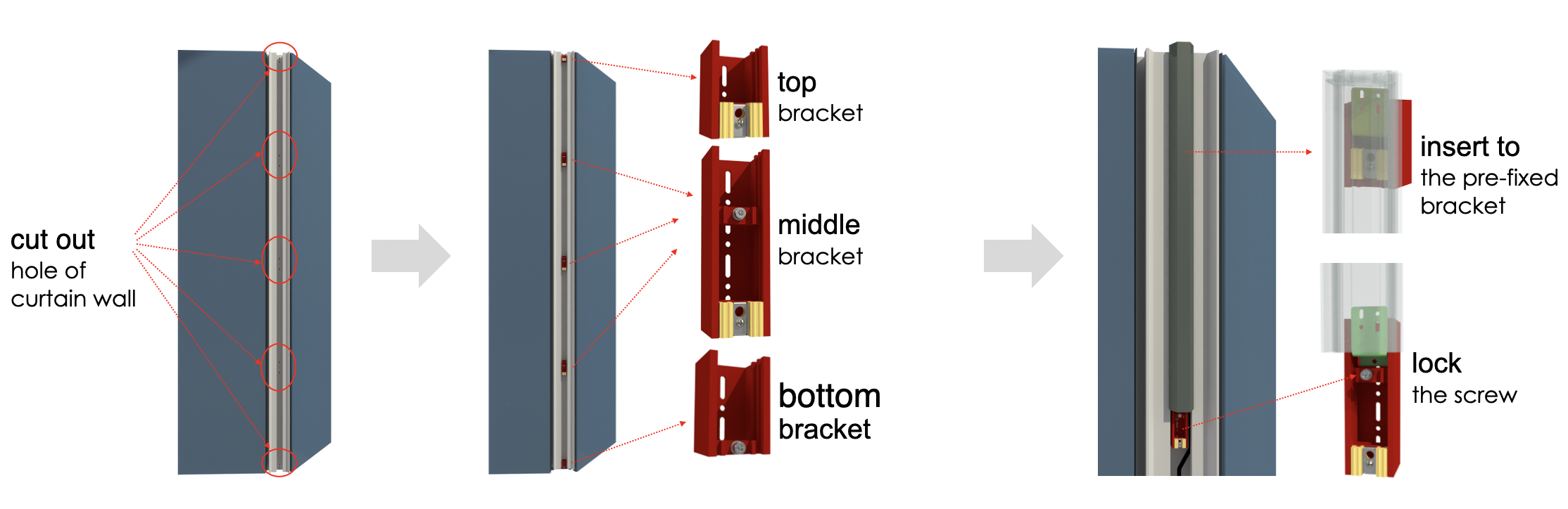 Place the recessed part of the curtain wall, and the top bracket of the fixture must correspond to the pre-fixed bracket of the curtain wall.